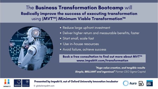Our founder Jenni Sacks, out of Oxford University Innovation, is the creator of the MVT™ approach which radically improves the success of executing transformation, at a faster pace and lower cost. Jenni is also the creator of the Tranformathon® which delivers change in 2 days, and creator of the SPOT™ (single point of truth) that sits in the software synthesizing all moving parts (internal and external, technical and people) in an easy to understand way, with all interdependencies built it. The technical approach also upskills, mobilises and engages the workforce at the same time, which is essential in maintaining the future transformed way of working.